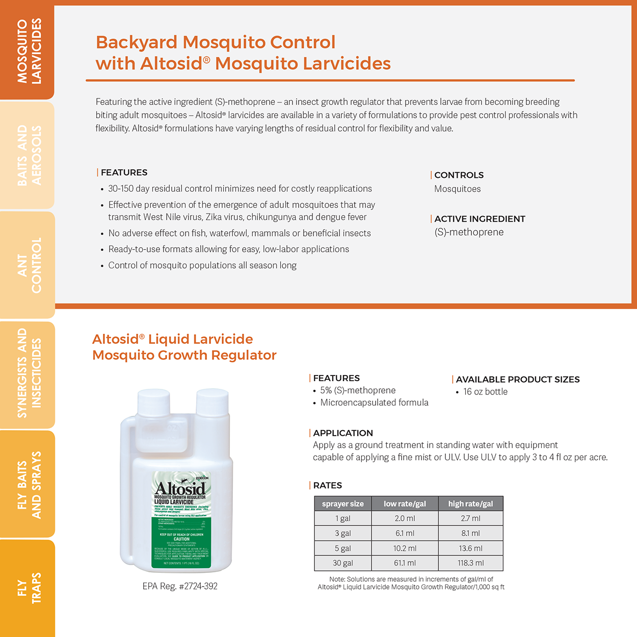 Featuring the active ingredient (S)-methoprene, Altosid Liquid Larvicide provides mosquito control professionals with flexibility. This formulation prevents larvae from becoming biting adult mosquitoes. Altosid Liquid Larvicide Mosquito Growth Regulator can be used as a pretreatment to potential breeding sites, offering complete control.