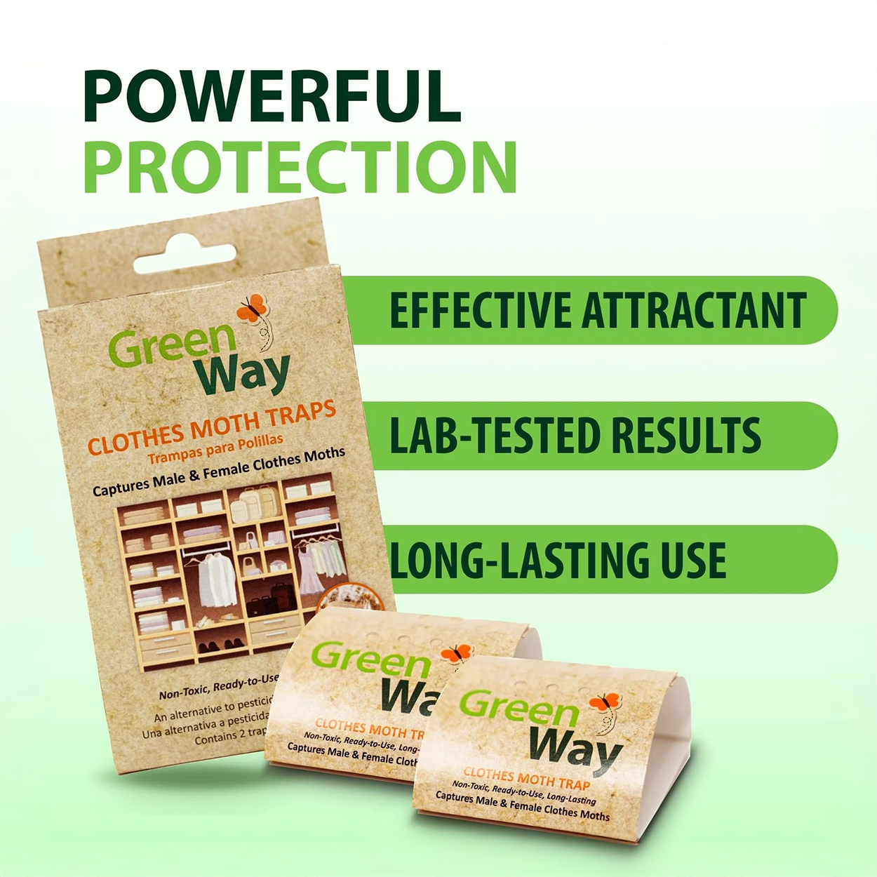 GreenWay Clothes Moth Traps are an alternative to pesticides and moth balls. The traps are non-toxic and environmentally friendly, ensuring safe use around clothes, rugs, and other fabrics. Both male and female clothes moths are trapped. These traps can be placed on the floor, or onto shelf inside a closet room.
