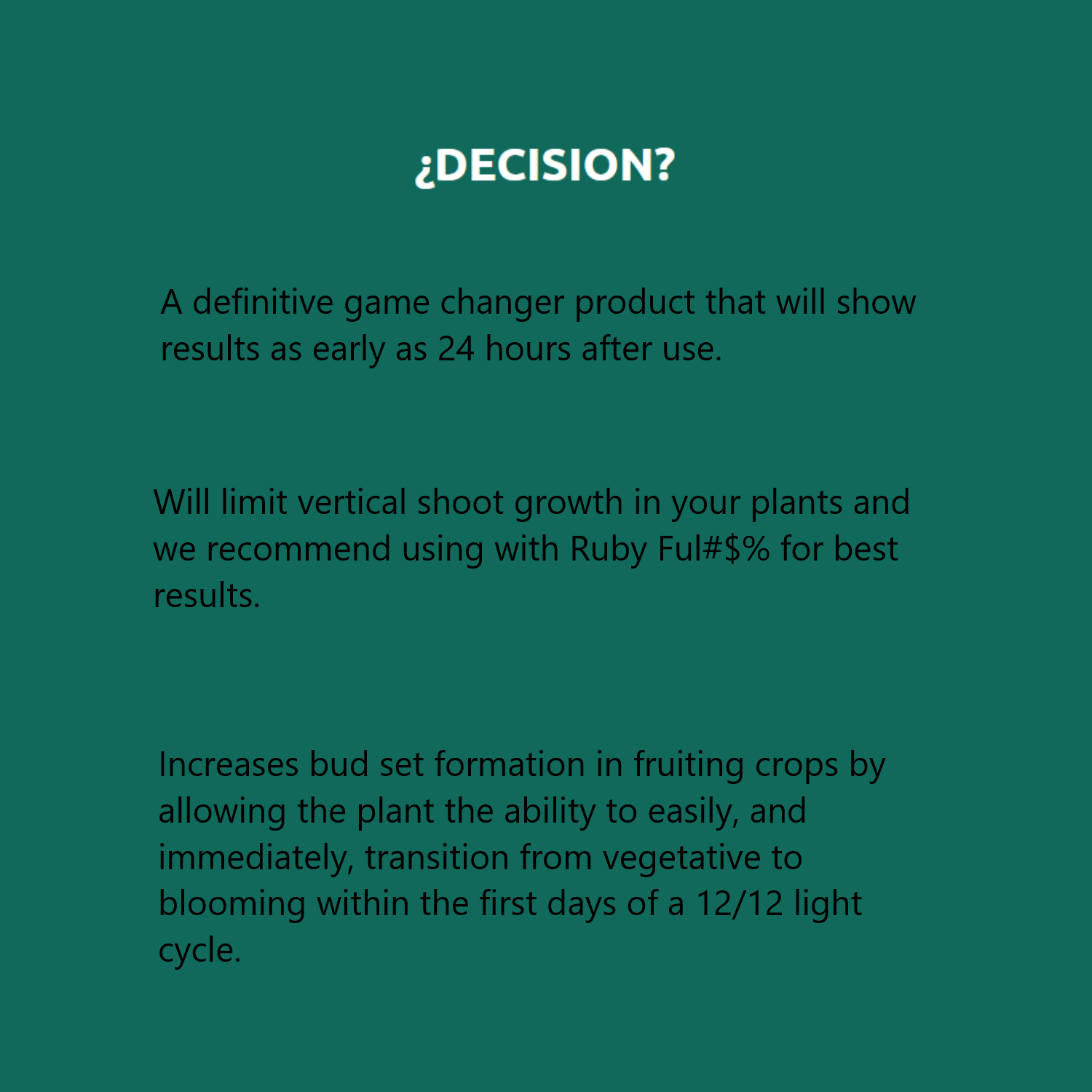 ¿Decision? is most commonly used as a stand-alone fertilizer to initiate rapid flowering response and development during the transitional phase from vegetative to reproductive growth. The formula comprising Decision’s chemistry also has a secondary use of ceasing prolific or excessive plant stretch and growth without the use of caustic plant growth regulators. Providing plants a strict diet of nothing but Decision will curtail plant frame building and increase reproductive site formation during week 1 of the blooming phase.