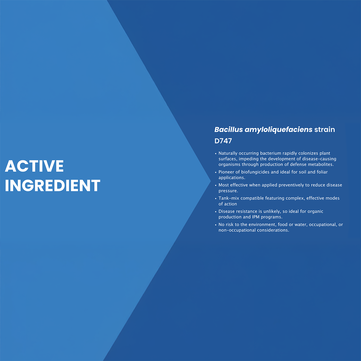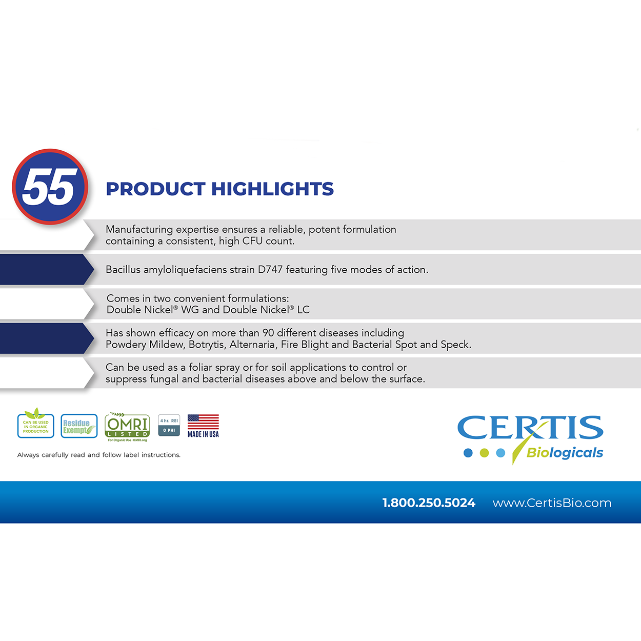 Double Nickel 55 features a naturally occurring bacterium that rapidly colonizes plant surfaces and impedes the development of disease-causing organisms, presents no risk to the environment or beneficial species, enables growth through improved nutrient uptake, and provides reliable tank-mix compatibility with a variety of other products