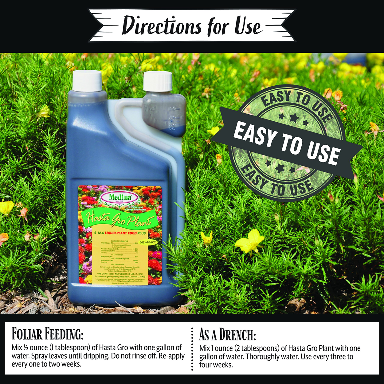HastaGro Plant Food 6-12-6 is actually three products in one. Hasta Gro Plant food contains high quality N-P-K plant food with a combination of Humic and Fulvic Acids, Medina Soil Activator and seaweed. These ingredients stimulate both the biological activity in the soil and promote blooming and fruiting.