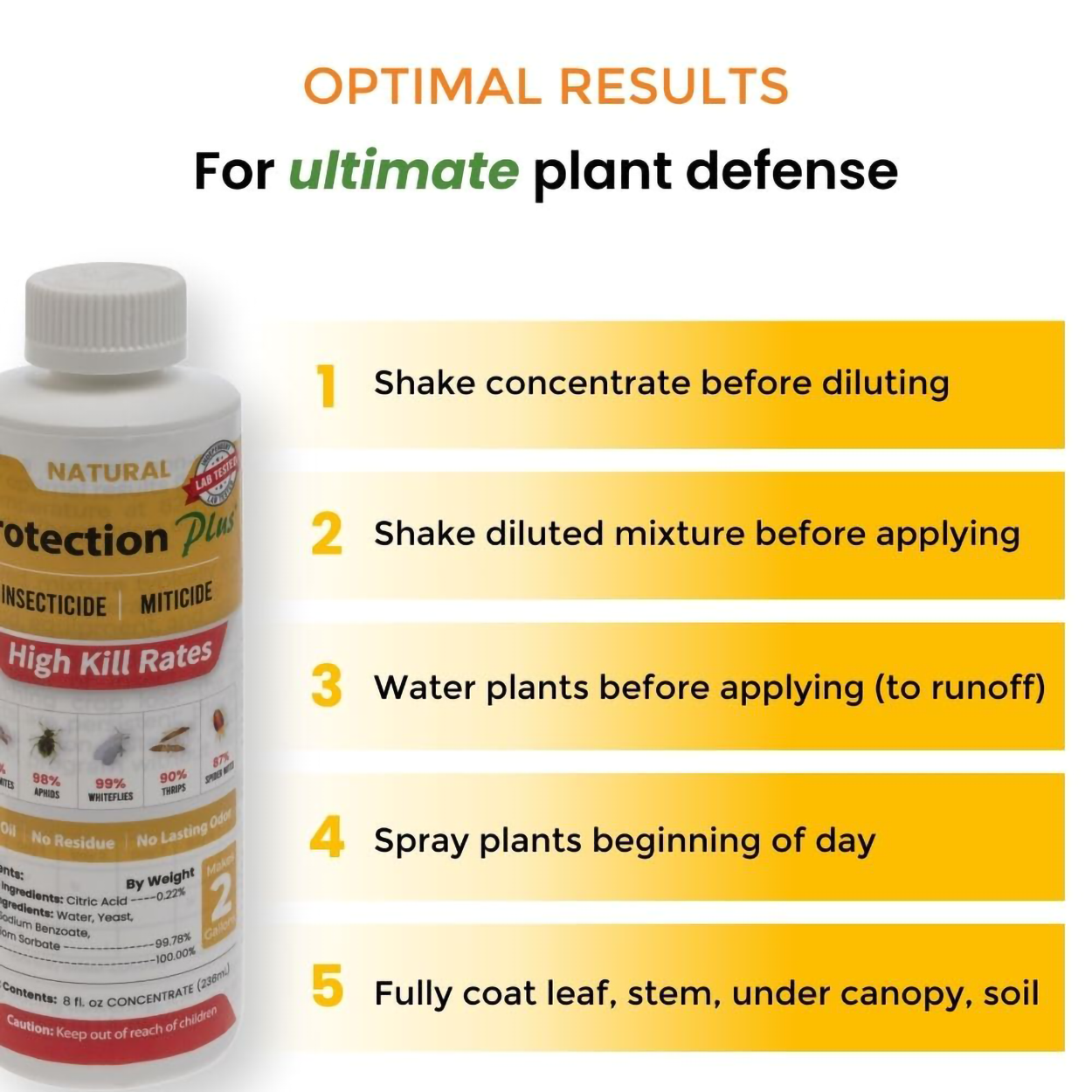 Protection Plus is a FIFRA 25(b) exempt, natural, oil-free insecticide and miticide that eliminates pests on the first application without damaging plants. This strong insecticide is easy to use, simplifying the treatment process by removing the need for complicated product combinations and complex application techniques. Instead, Protection Plus works the first time, killing insects without requiring additional chemicals. For the best citric acid insecticide on the market, choose Protection Plus.